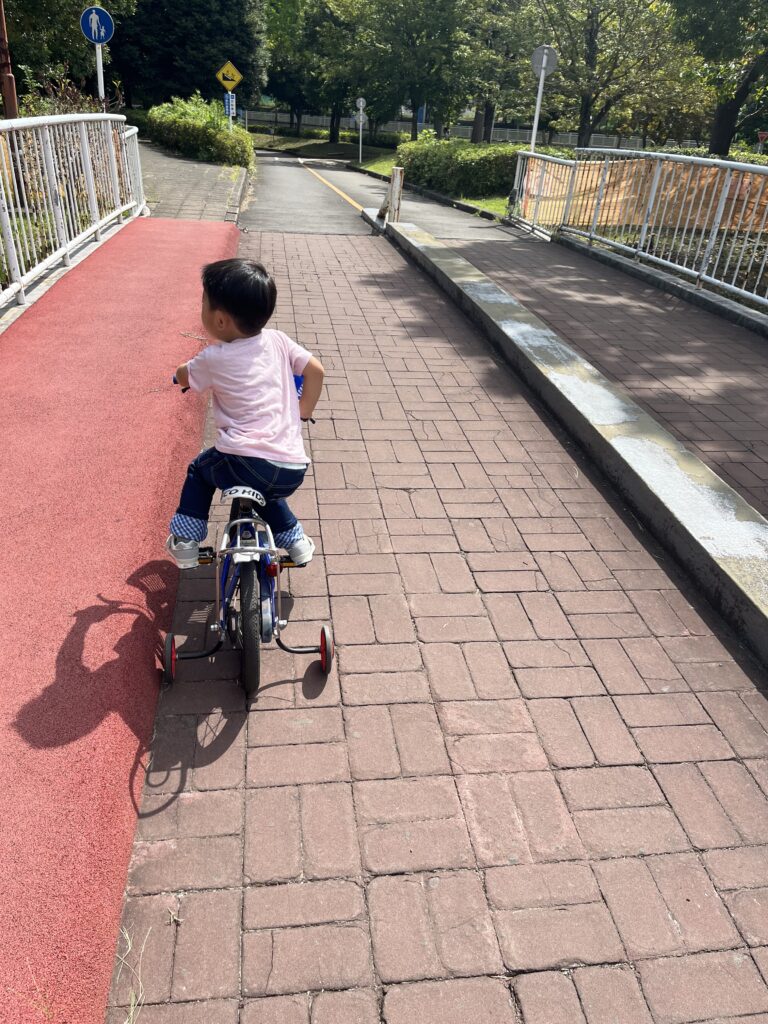 同じ年くらいのお友達にどんどん抜かされますが、とてもマイペース。芝生や植木に気を取られながらのろのろと進みます。下り坂では少しスピードがでるので楽しそう。補助輪のおかげで転んだりしないのでこちらも安心。