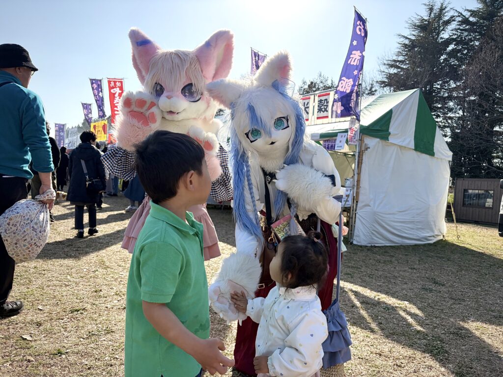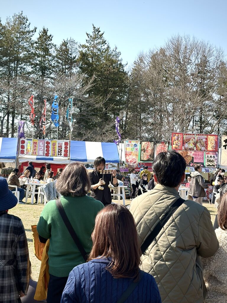 屋台前にもテーブルや椅子はありますが、数が限られています。また、古河桃まつりはテントNGなので、景色の良い場所や、ステージが見える芝生エリアにレジャーシートを敷いて、ピクニック気分で屋台グルメを楽しむのがおすすめです♪