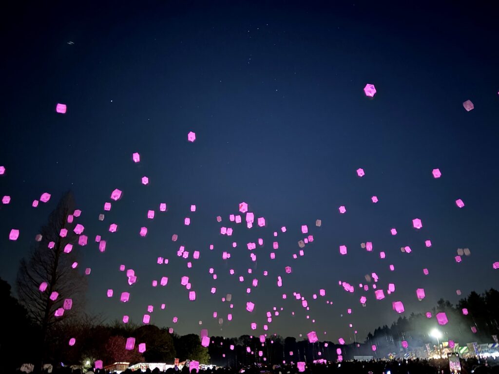 そして、私たちが訪れた3月21日限定で開催されていたのが「スカイランタン」のイベント! 願い事を書いたランタンを一斉に夜空へ飛ばす景色は、本当に幻想的でした。ファミリーの参加者もすごく多かったです。
